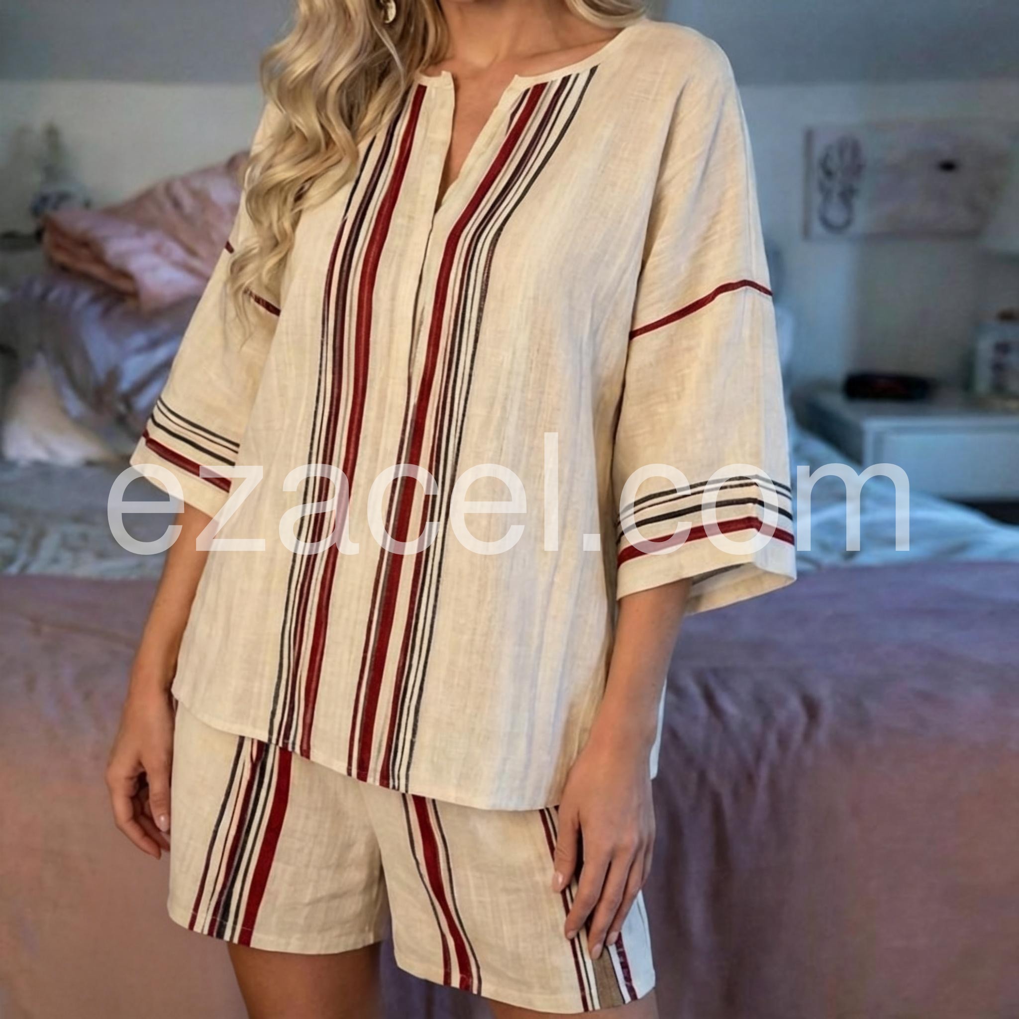 Yes! It runs true to the garment size chart please choose your size based on your measurements.This sophisticated two-piece set features a flattering V-neck design complemented by classic striped patterns. Engineered for optimal comfort without sacrificing style, the coordinated pieces offer versatile styling options for various occasions. The thoughtfully constructed silhouette provides a polished appearance while maintaining ease of movement throughout the day.